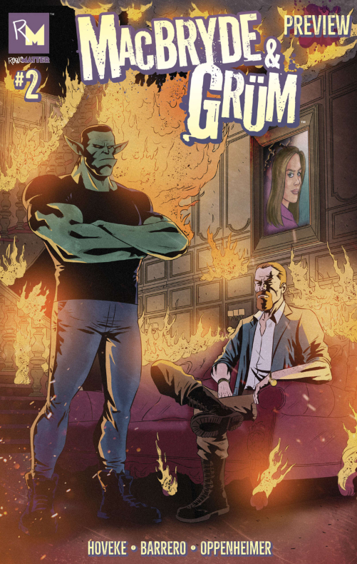 Firey events surround Loughlin’s iconic ‘White House’ mansion, catapulting the stakes to new heights and weaving a web of intrigue that will leave you breathless." Paranormal comic written by Steven Hoveke. Interior art by Andres Barrero. Buy it here: MACBRYDE & GRÜM #2